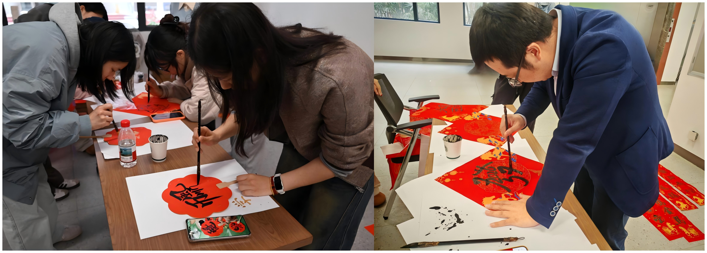 红纸铺展,墨香四溢,写对联、团扇DIY环节成为活动中一抹雅致的亮色。学院邀请了有书法特长的领导与老师,与留校学子一同执笔挥毫,将新春的美好期许凝于笔尖。一张张福字、一副副对联、一柄柄团扇,既是手作的心意,更是新春的祝福,学子们或互赠作品,或悉心珍藏,让温暖在指尖传递。